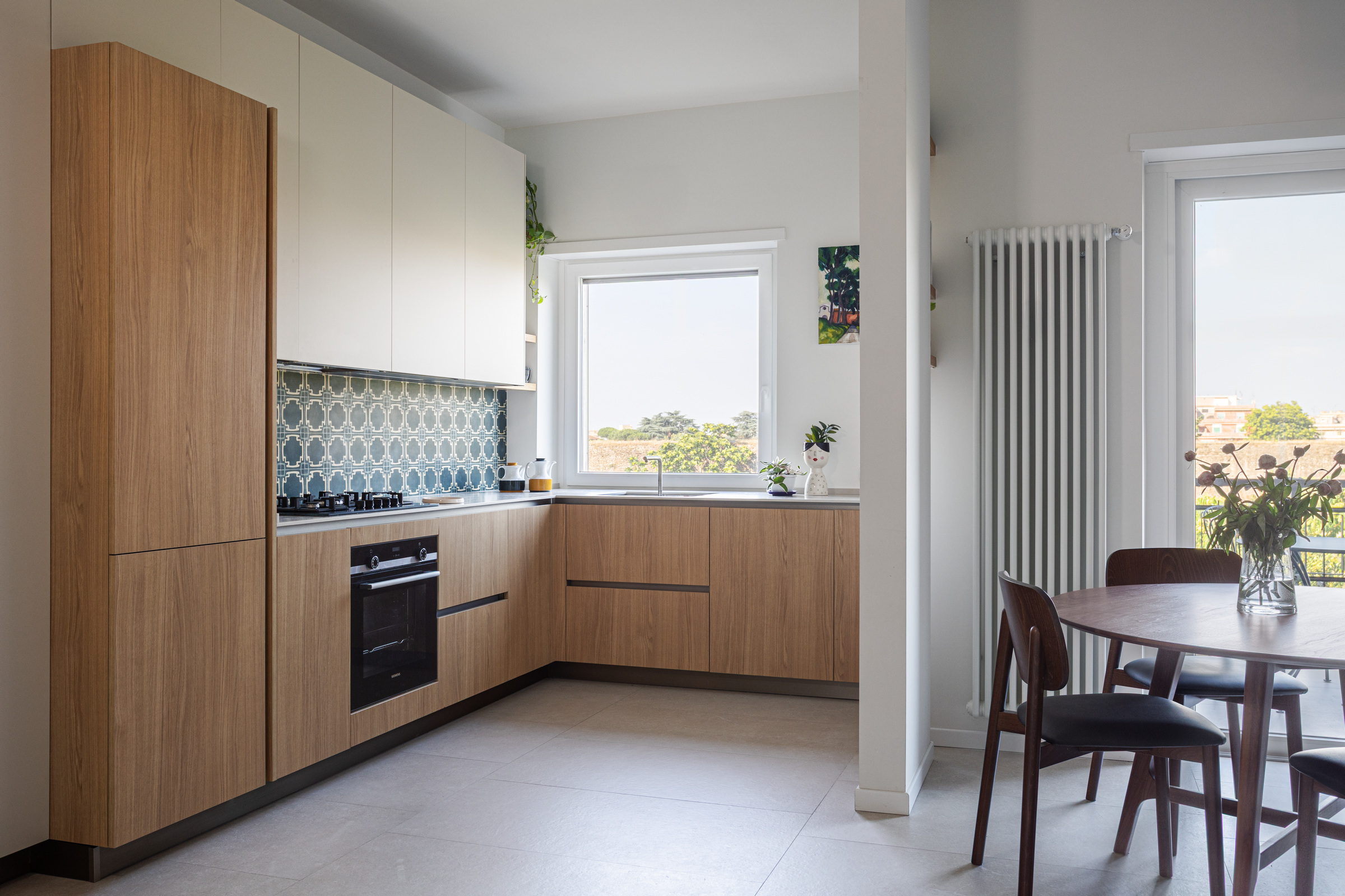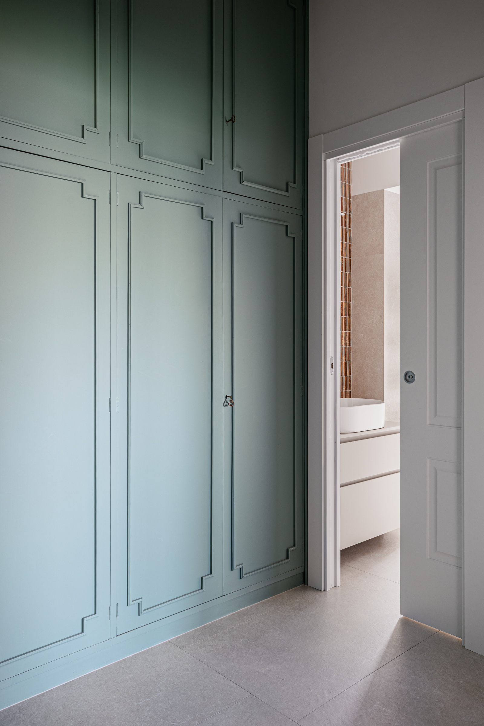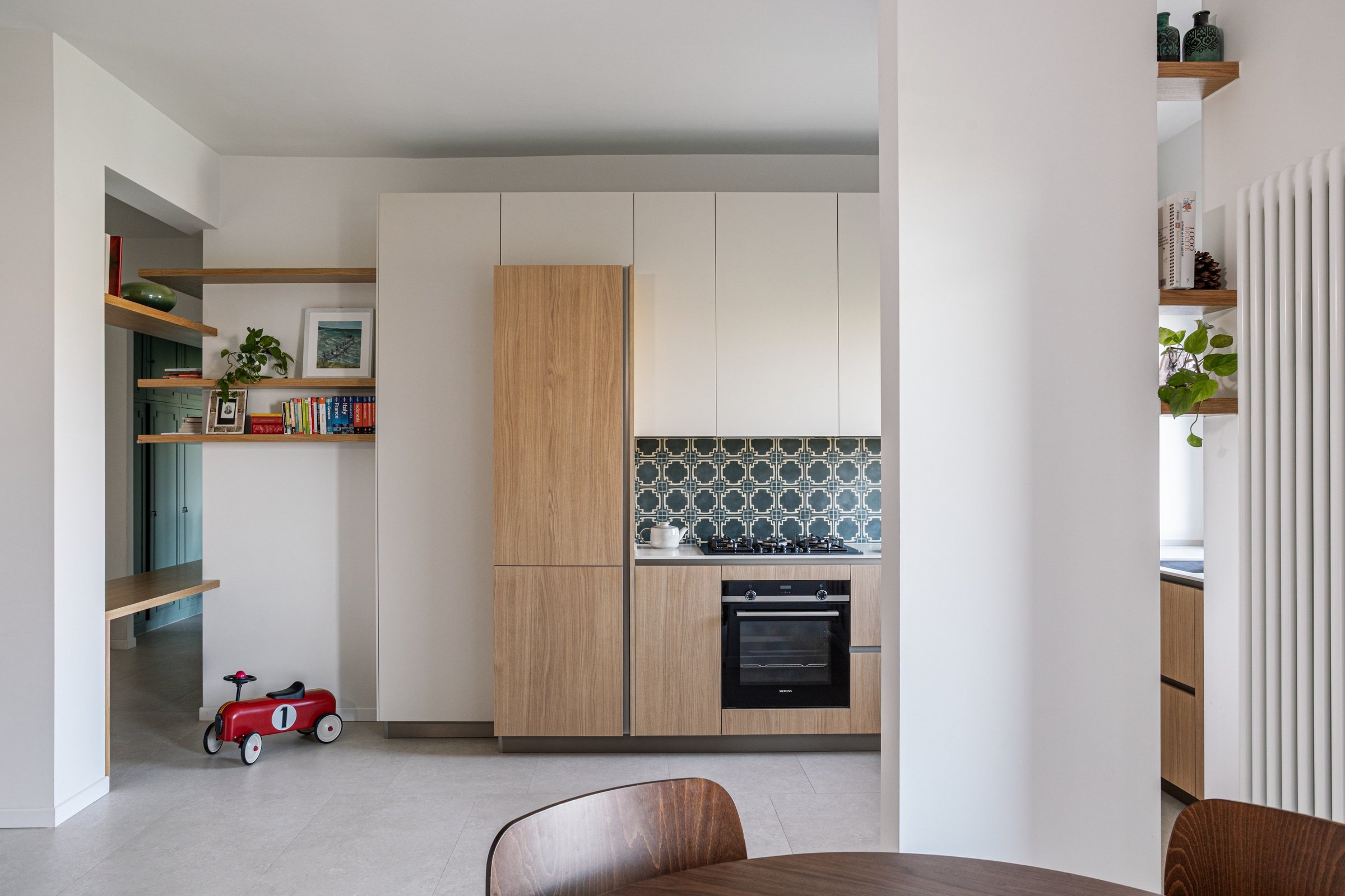 The kitchenāconceived as more than a purely functional spaceāfeatures a layout that connects seamlessly with the living area while still preserving its own identity. Throughout the apartment, clean lines and soft tones in the vertical elements establish a calm dialogue with the flooring.