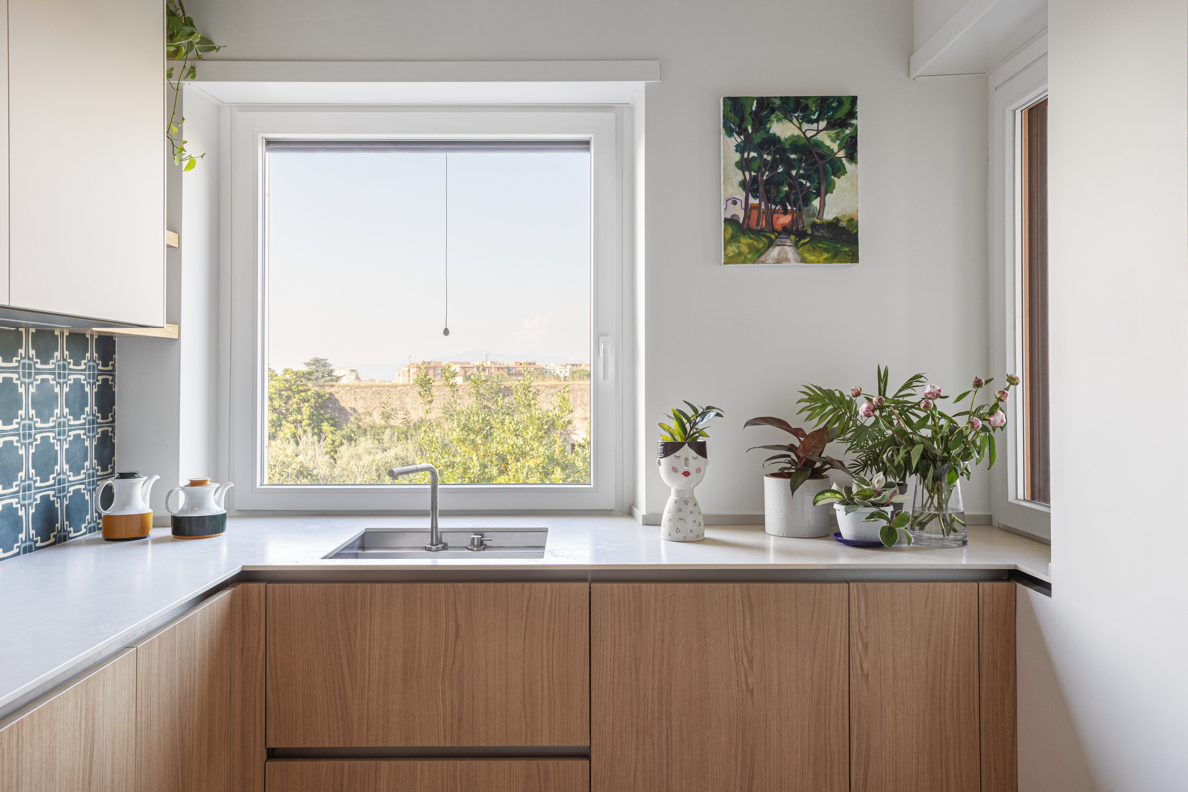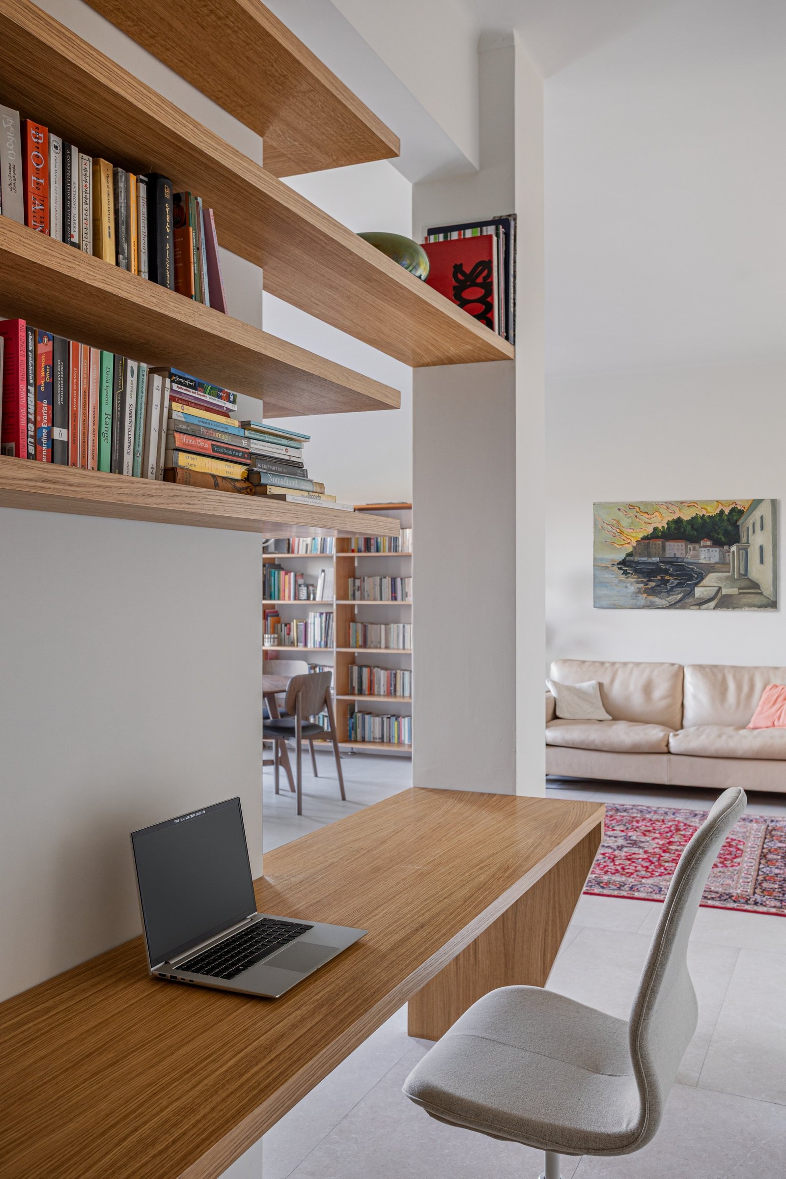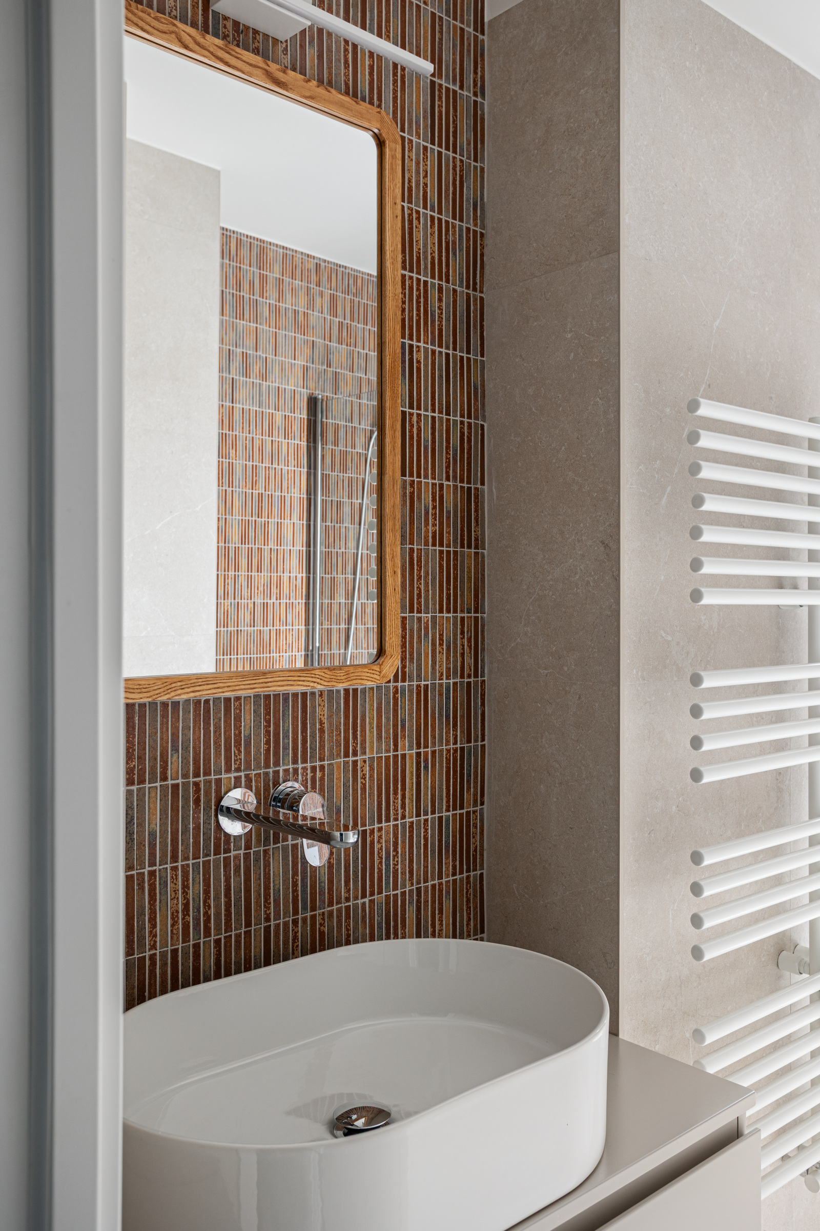 The kitchenāconceived as more than a purely functional spaceāfeatures a layout that connects seamlessly with the living area while still preserving its own identity. Throughout the apartment, clean lines and soft tones in the vertical elements establish a calm dialogue with the flooring.