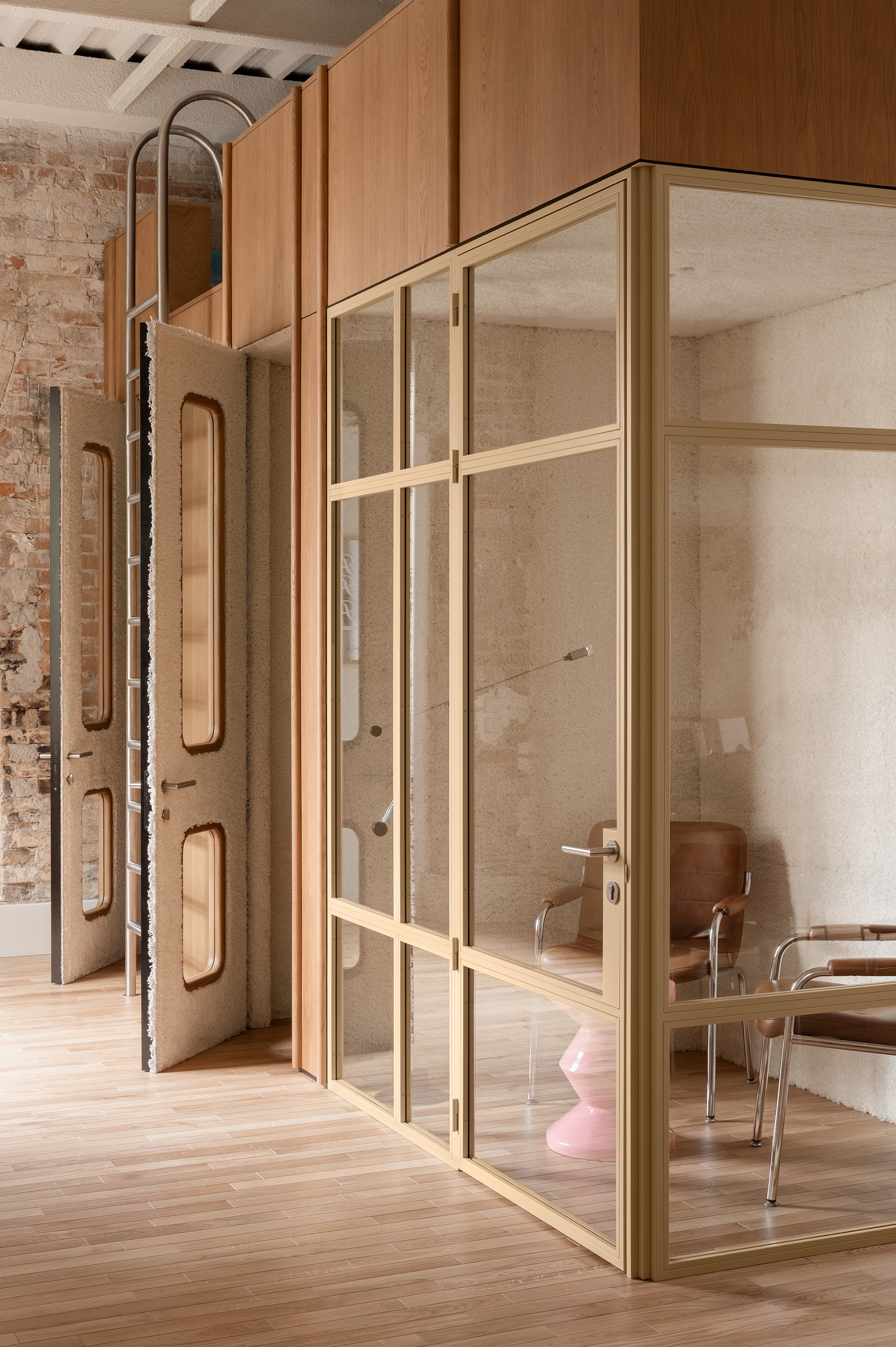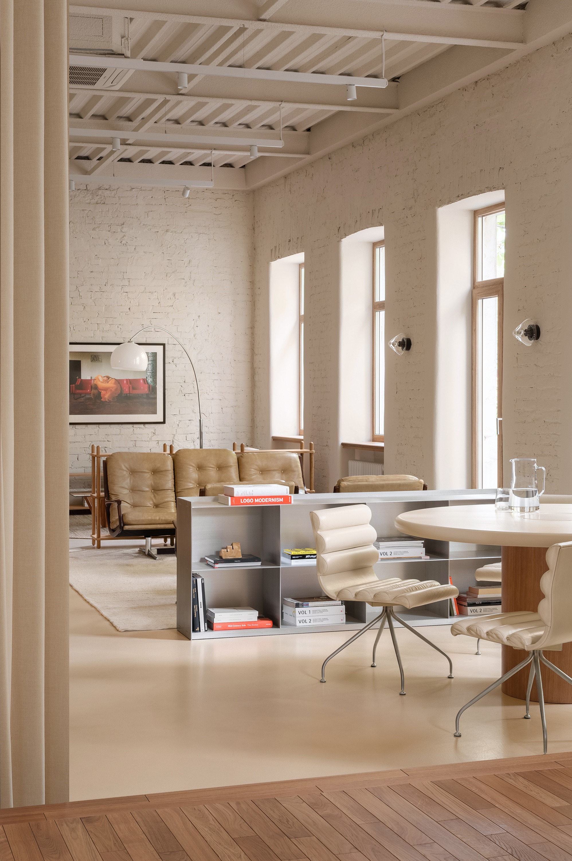 On the stage, a mobile work zone is furnished with custom-made tables and lightweight folding chairs; opposite it, a relaxation area features a vintage sofa, armchairs, and an Italian glass table with a sculptural metal base.