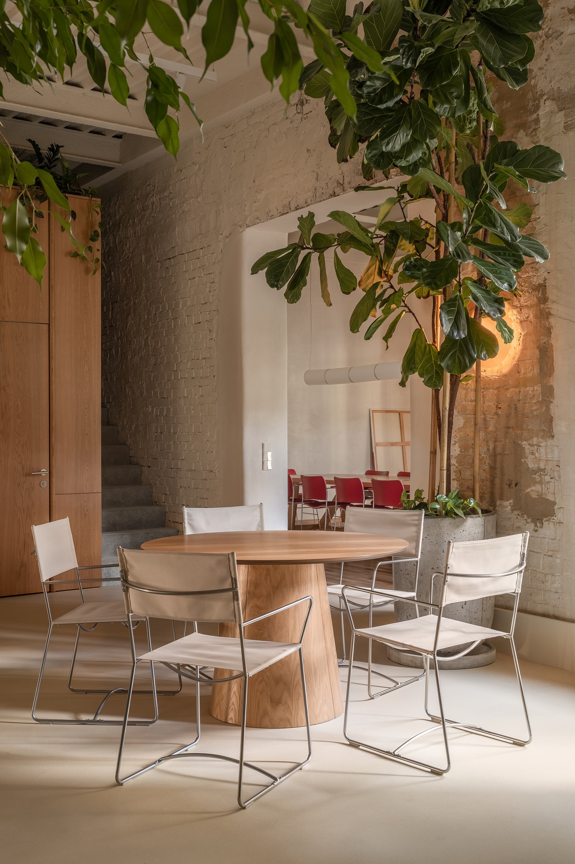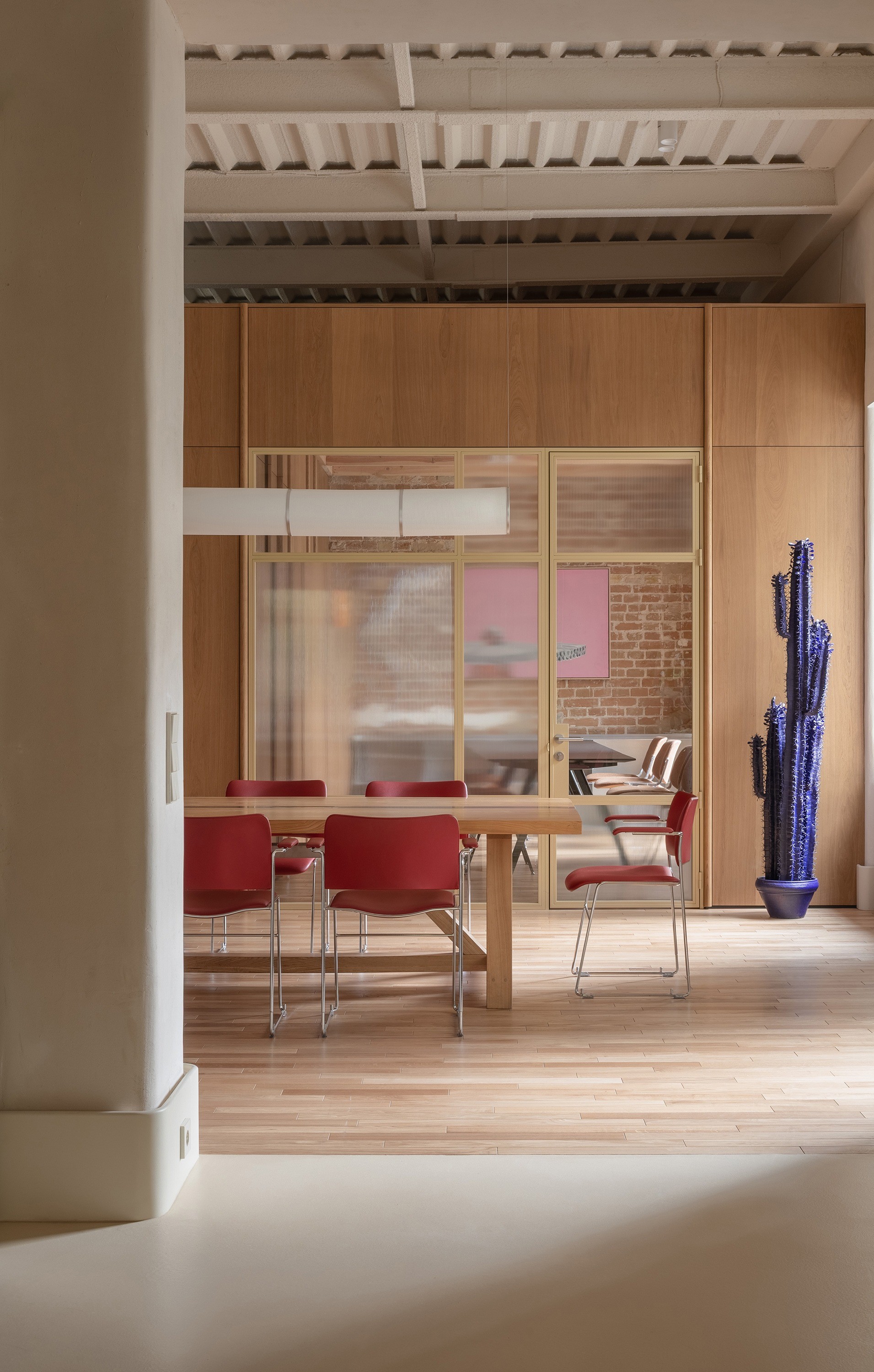 Defined by high ceilings and rich historic textures, the space has been organized to fully exploit its architectural plasticity while maintaining a warm, welcoming atmosphere for a large team.