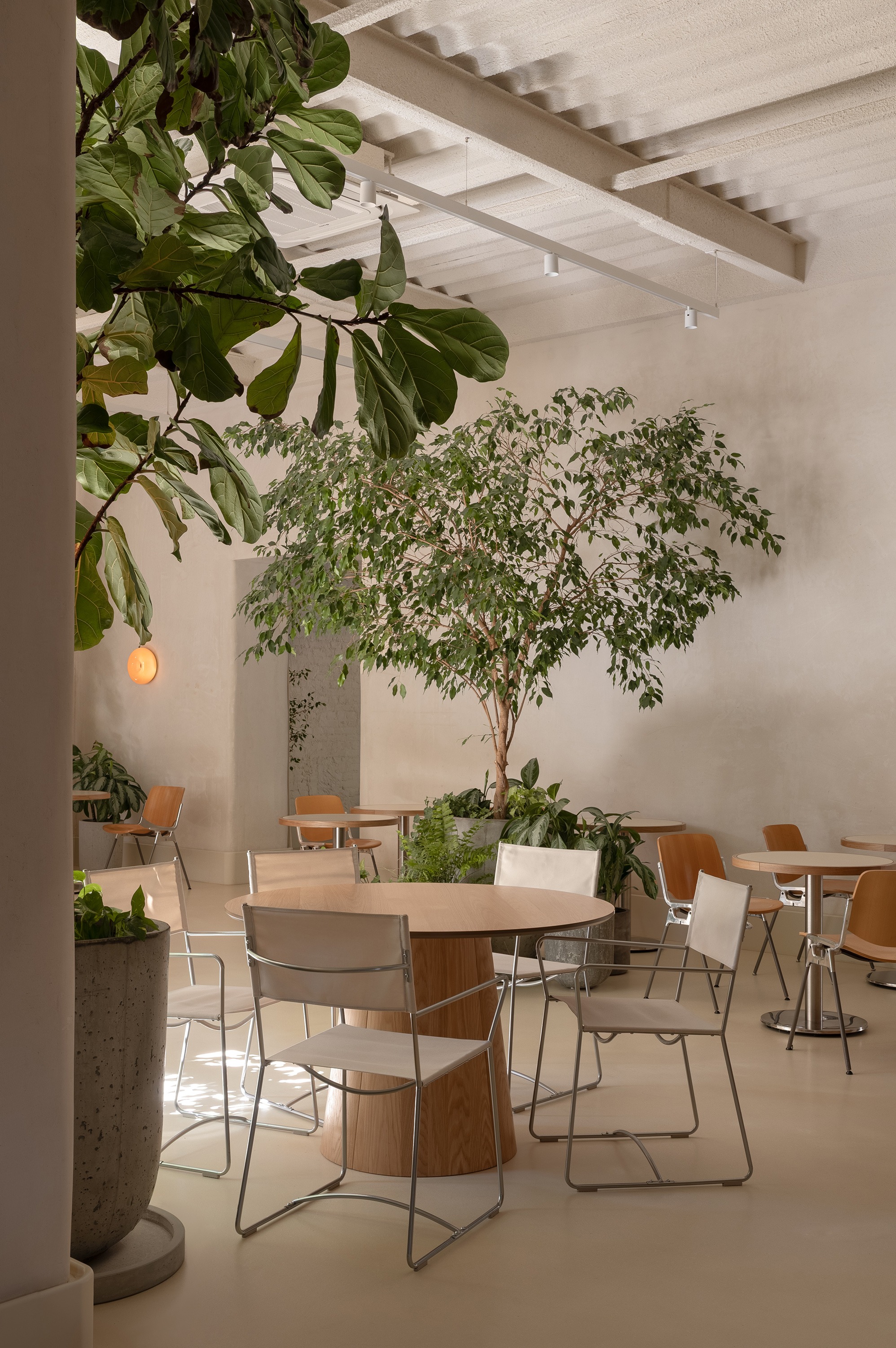 The conventional desk layout has been abandoned in favor of free seating, with informal lounge-style groupings and shared worktables. Each area is designed to adapt fluidly to everyday needs.