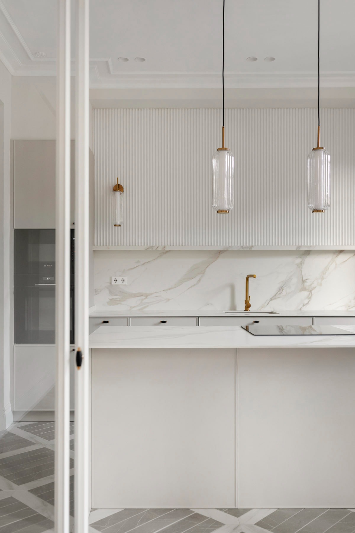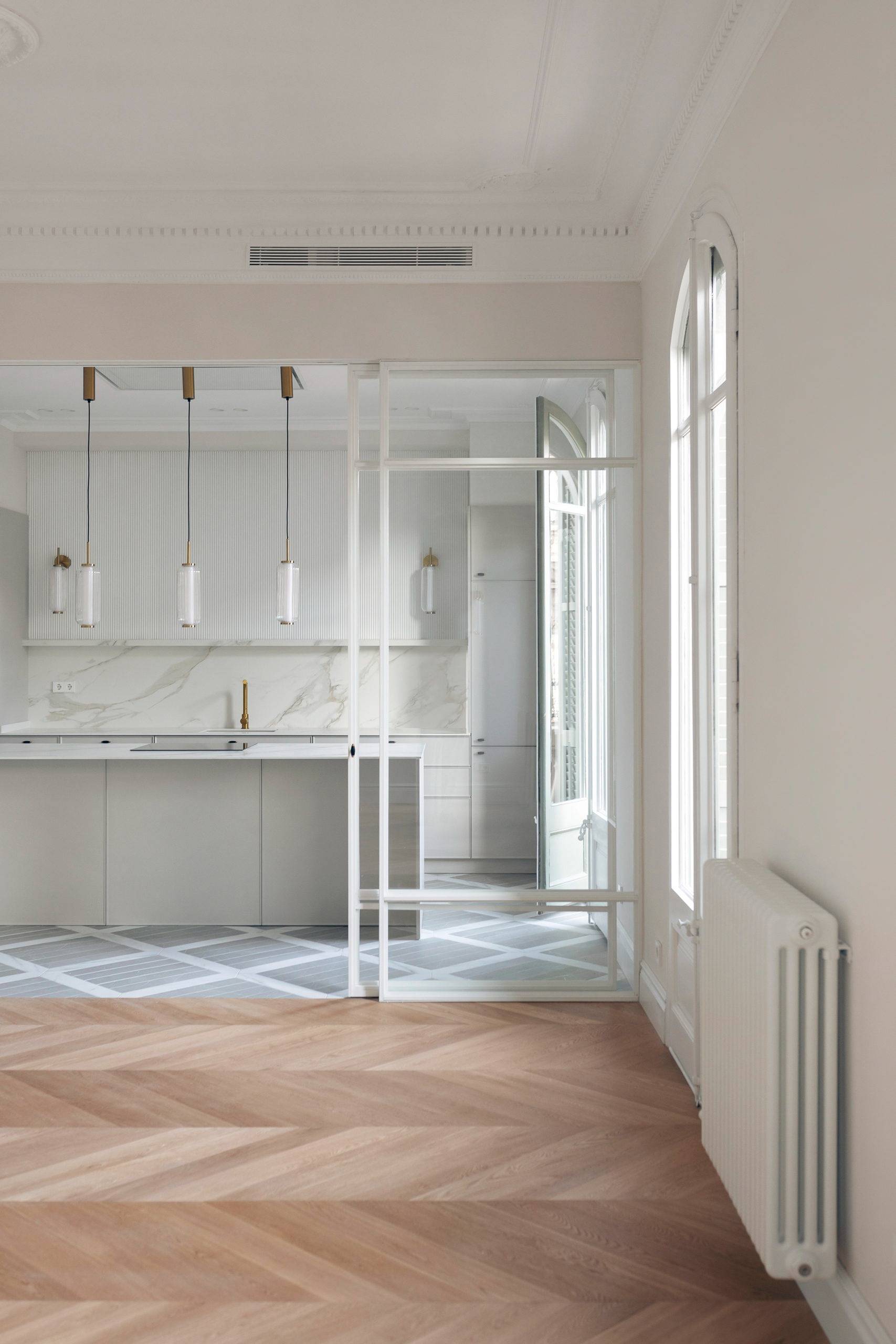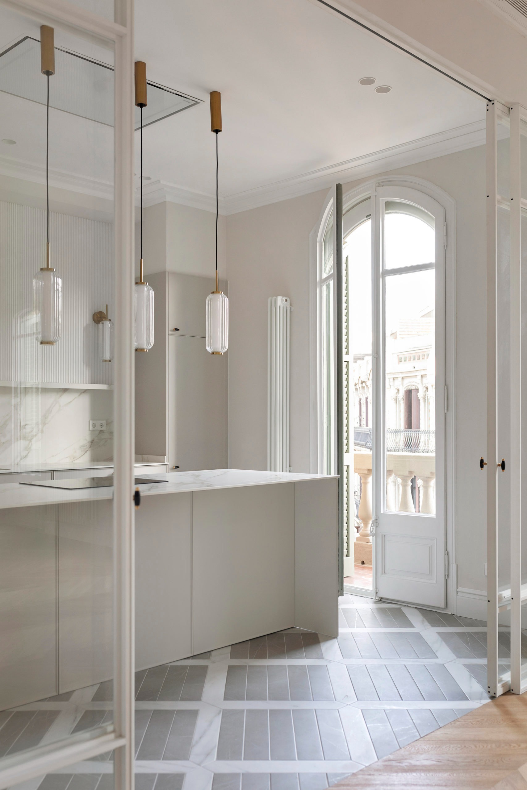 The kitchen opens onto the main living area through a large glass partition with sliding doors, combining neutral tones with subtle copper accents in the fixtures and lighting. The central island also doubles as a casual dining spot.
