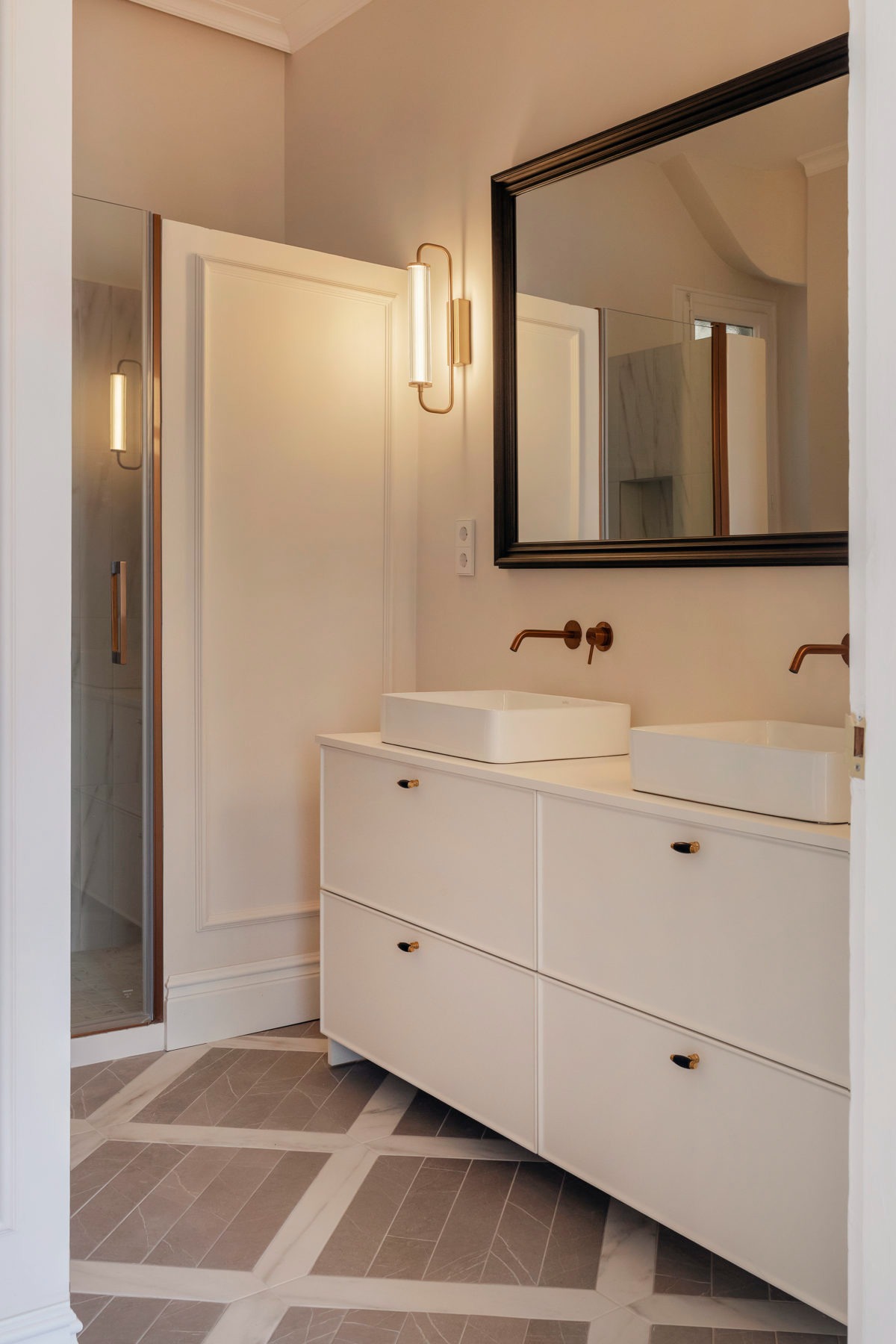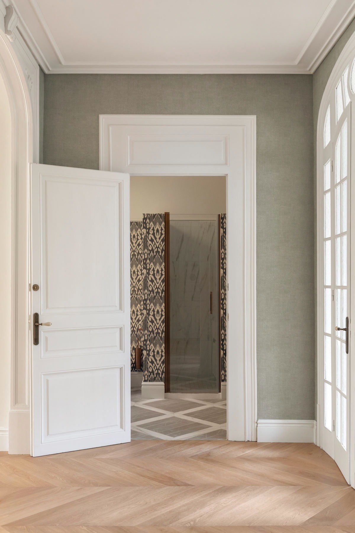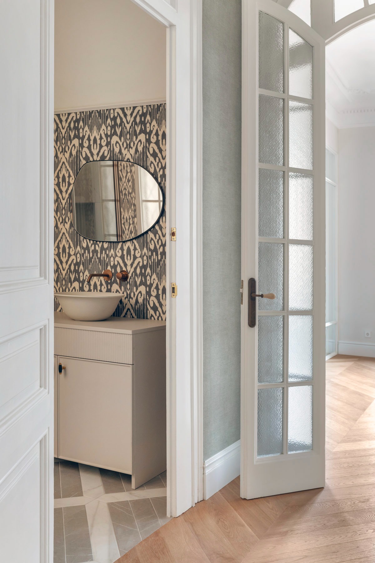 Both bathrooms have been fully renovated; while they share the same overall style, the guest bathroom stands out with a more refined look, where wallpaper becomes the true focal point of the space.