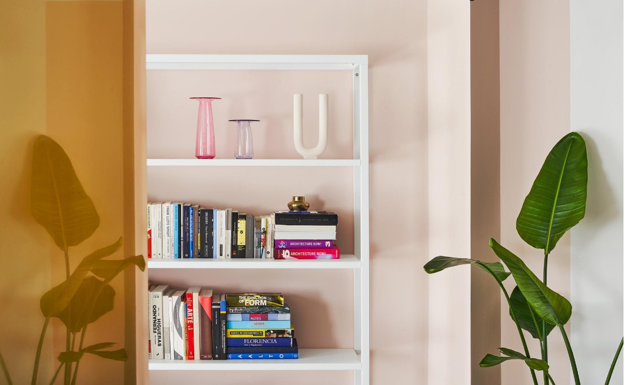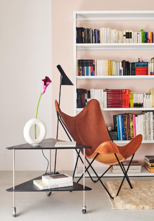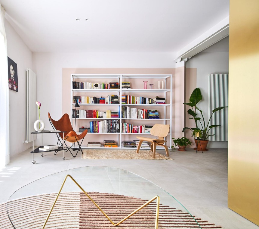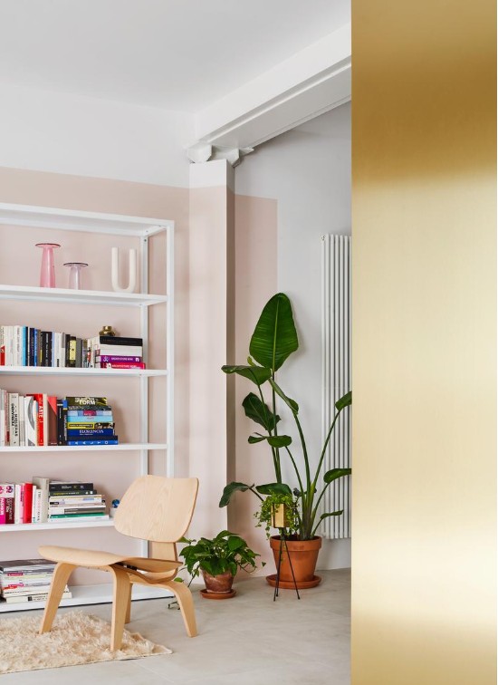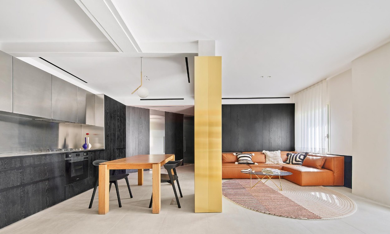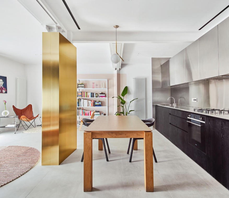 With such a simple layout, materials take center stage in shaping the atmosphere. A continuous strip of open-pore black-stained oak runs along several walls, into the triangle, and across the base of the kitchen. It unifies distinct functions with a single texture. Stainless steel doors blend flush with the wood and also define the upper kitchen cabinetry. Most of the central space is white, except for the library wall, which reveals a pale pink backdrop. That same shade appears on the floor and ceiling of the triangular zone. The brass-clad pillar, stopping at the height of the lower ceiling, reinforces its dual role as structural support and spatial anchor.
