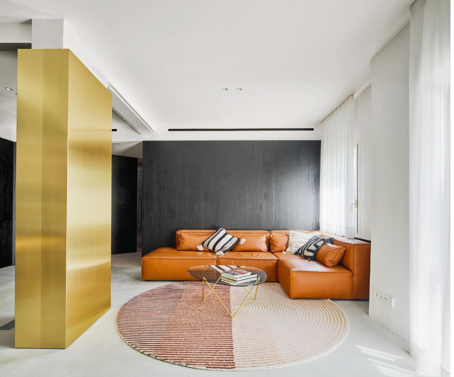 Conceptually, the triangle is the generator of the plan. It defines the rotation of the layout, and its diagonal logic reappears throughout: the brass-clad pillar is trapezoidal with one slanted side, custom brass furniture echoes triangular motifs, and the en-suite bathroom doorāmade of brushed stainless steelāis split diagonally to create privacy. Even the 60x60 floor tiles are arranged to solve the 615 cm span with a diagonal rhythm of 15 cm inserts.