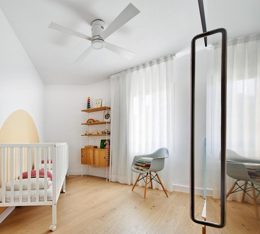 The apartment sits on a high floor of a chamfered block facing southeast, with open views stretching toward MontjuĆÆc thanks to the nearby train tracks. The original layout featured two narrow bays, each only three meters wide, divided into a sequence of small rooms that no longer matched modern living needs.