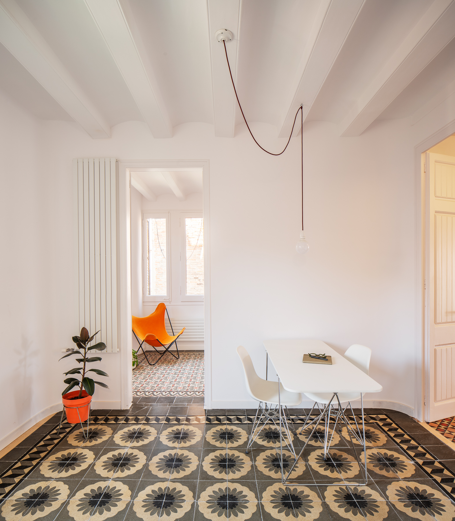 Most of the original flooring has been preserved and restored. It stands out in contrast with the white walls and ceilings, and its bold colors gain even more presence. Where the original floors could not be recovered, white marble and porcelain tiles have been used instead.