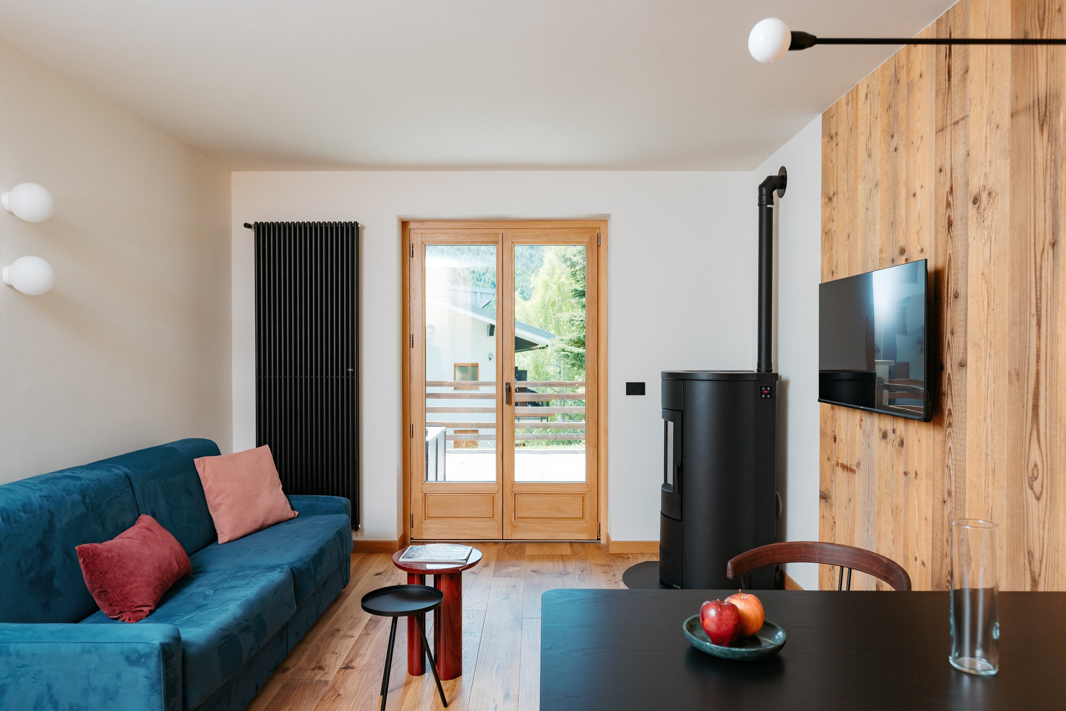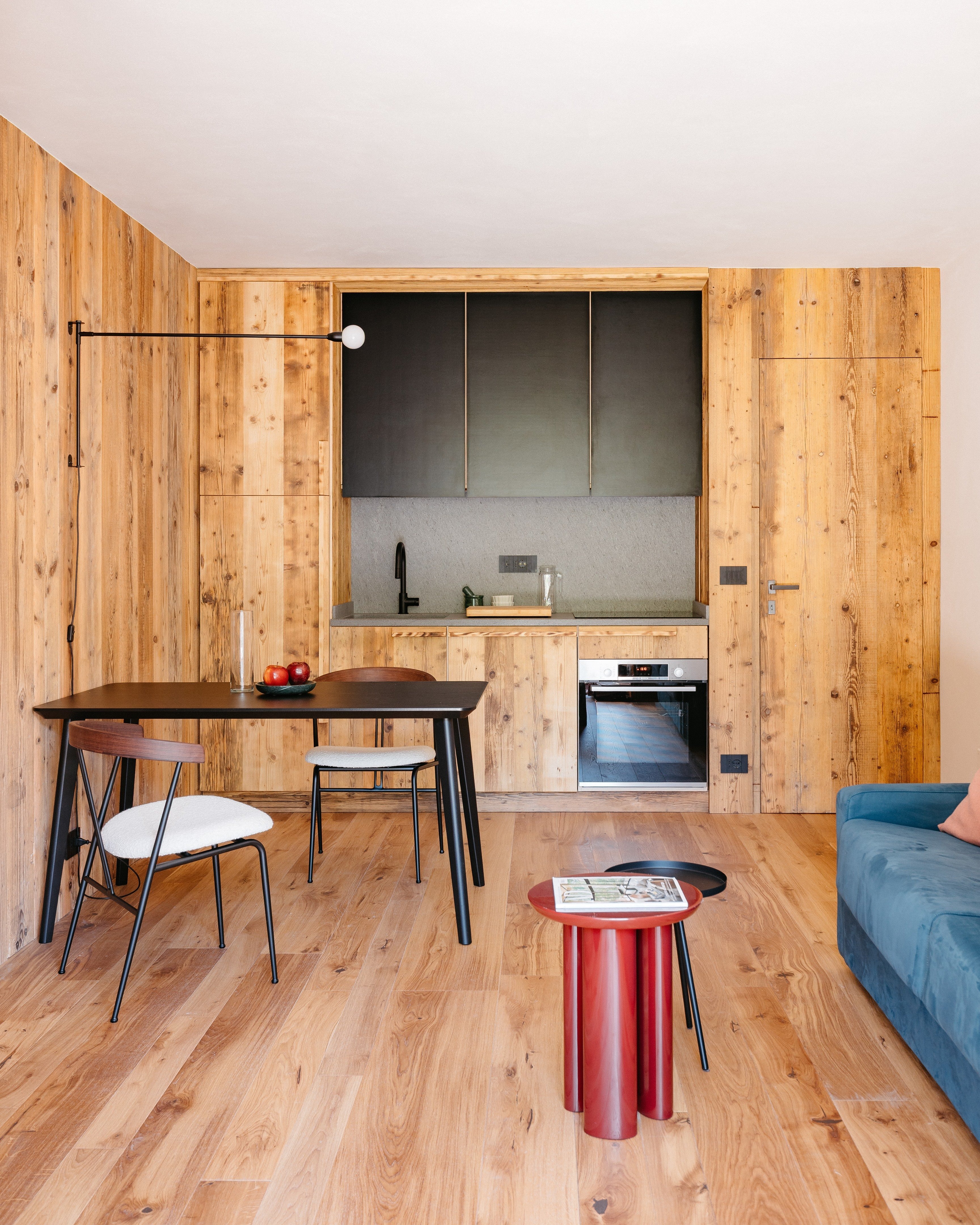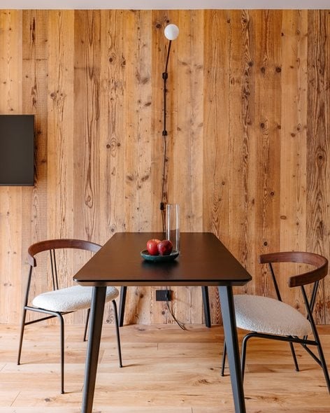 El mobiliario y los revestimientos reinterpretan, con variantes personalizadas y detalles de diseño, el estilo tradicional de las casas de montaña, acentuado por los cálidos tonos de la madera. Para las boiseries y los frentes de cocina se eligió abeto viejo recuperado (procedente de la demolición de antiguas cabañas), lo que aporta un carácter auténtico y sostenible a los espacios. En los suelos del salón y el dormitorio se optó por parquet de roble, garantizando elegancia, durabilidad y calidez visual.