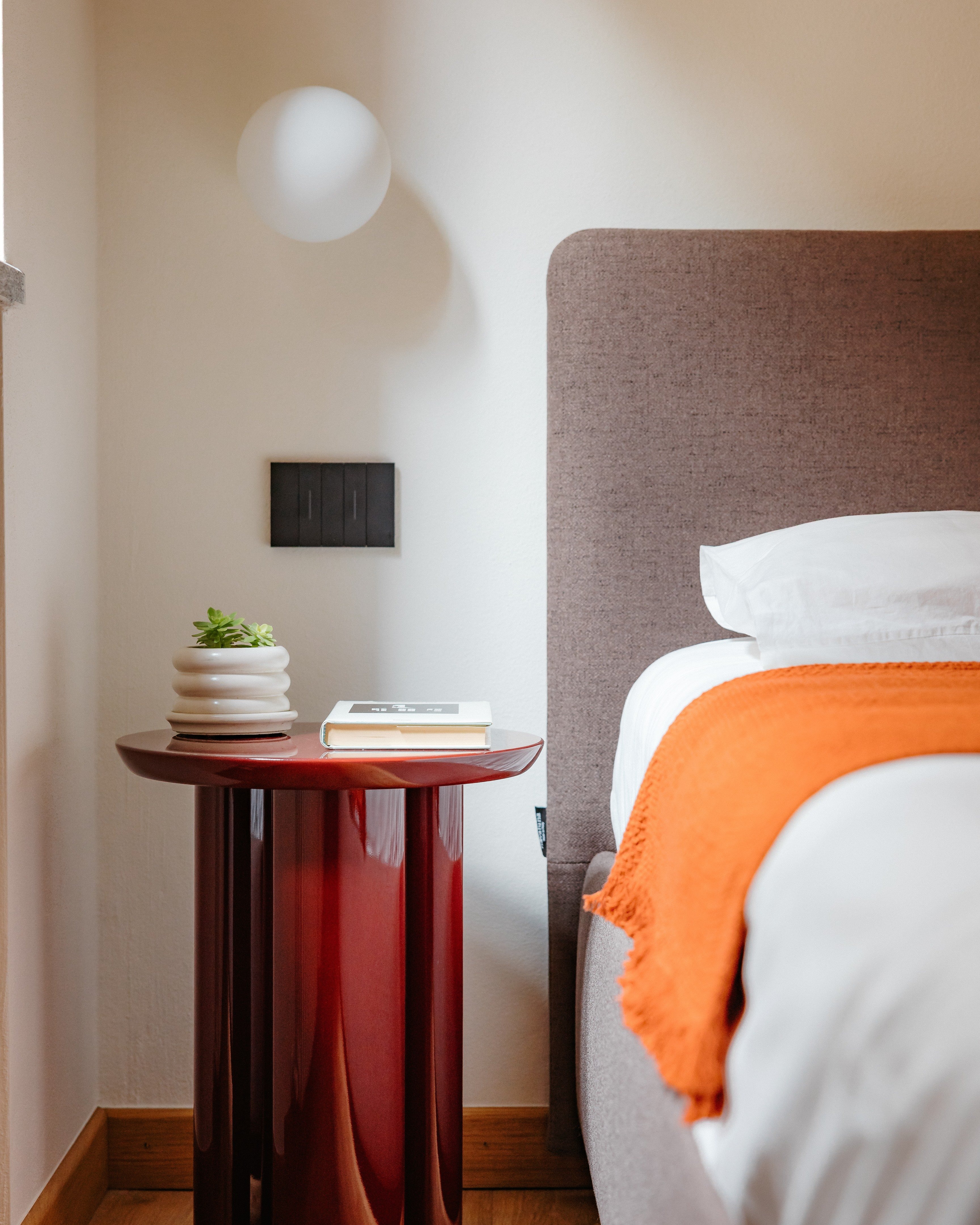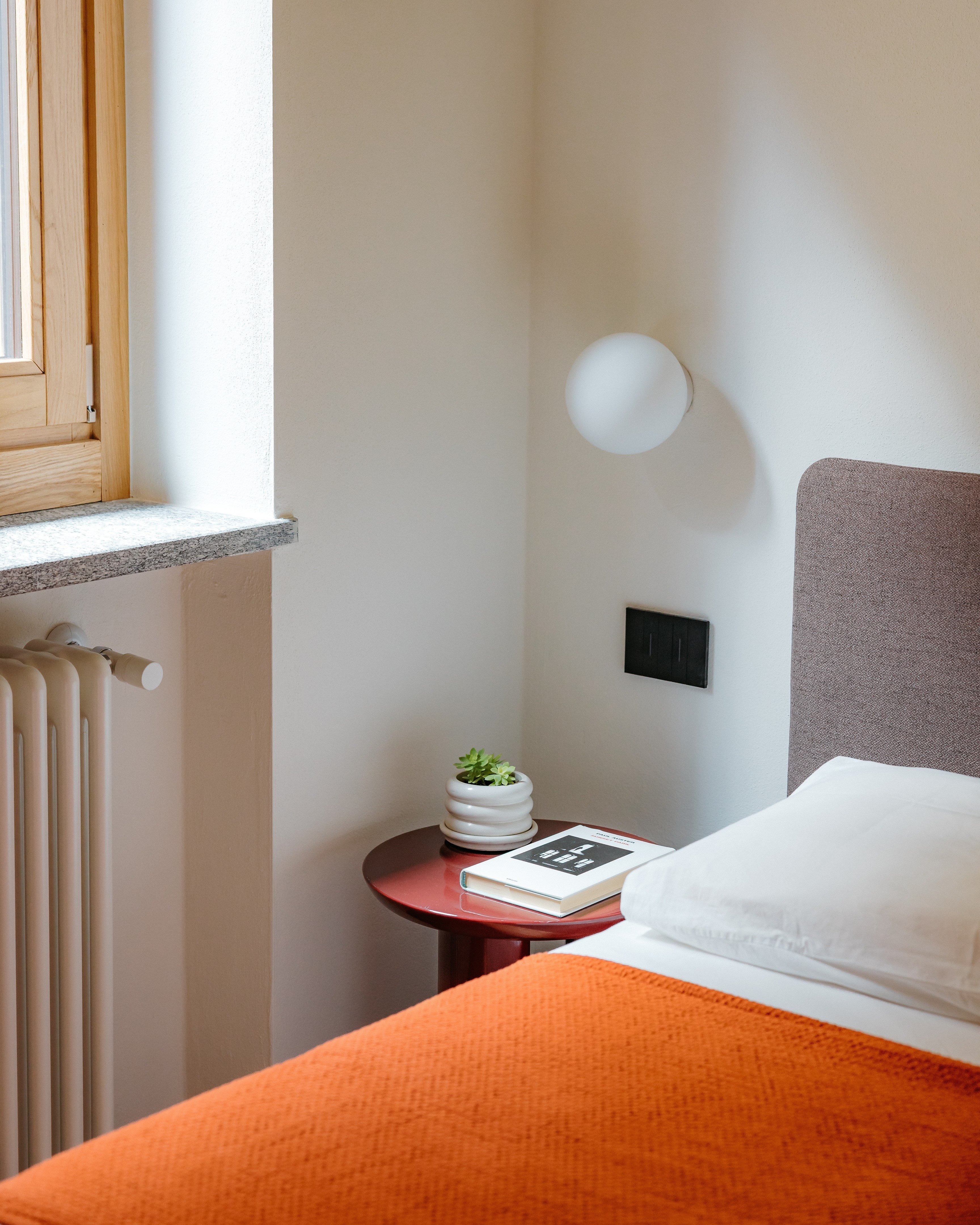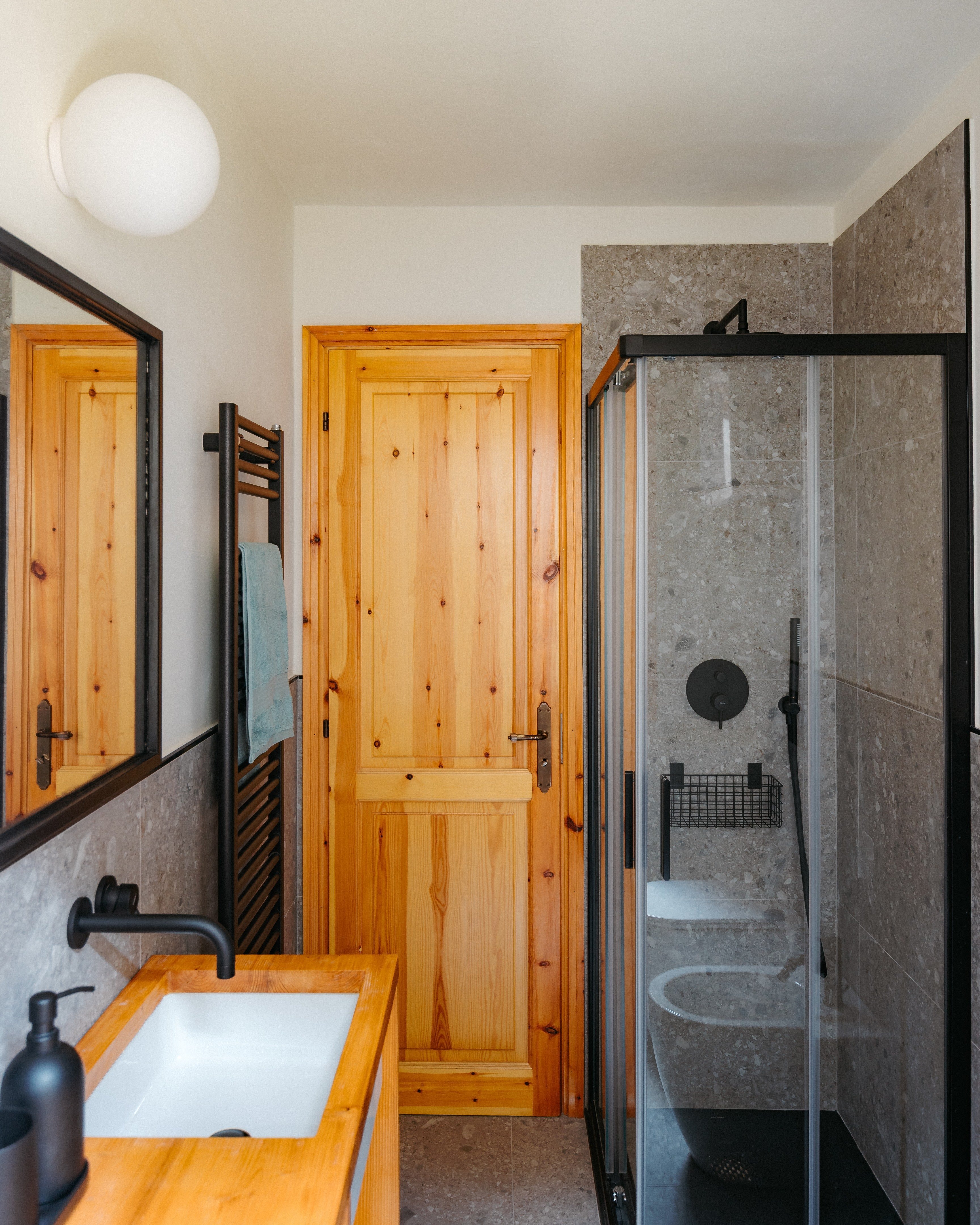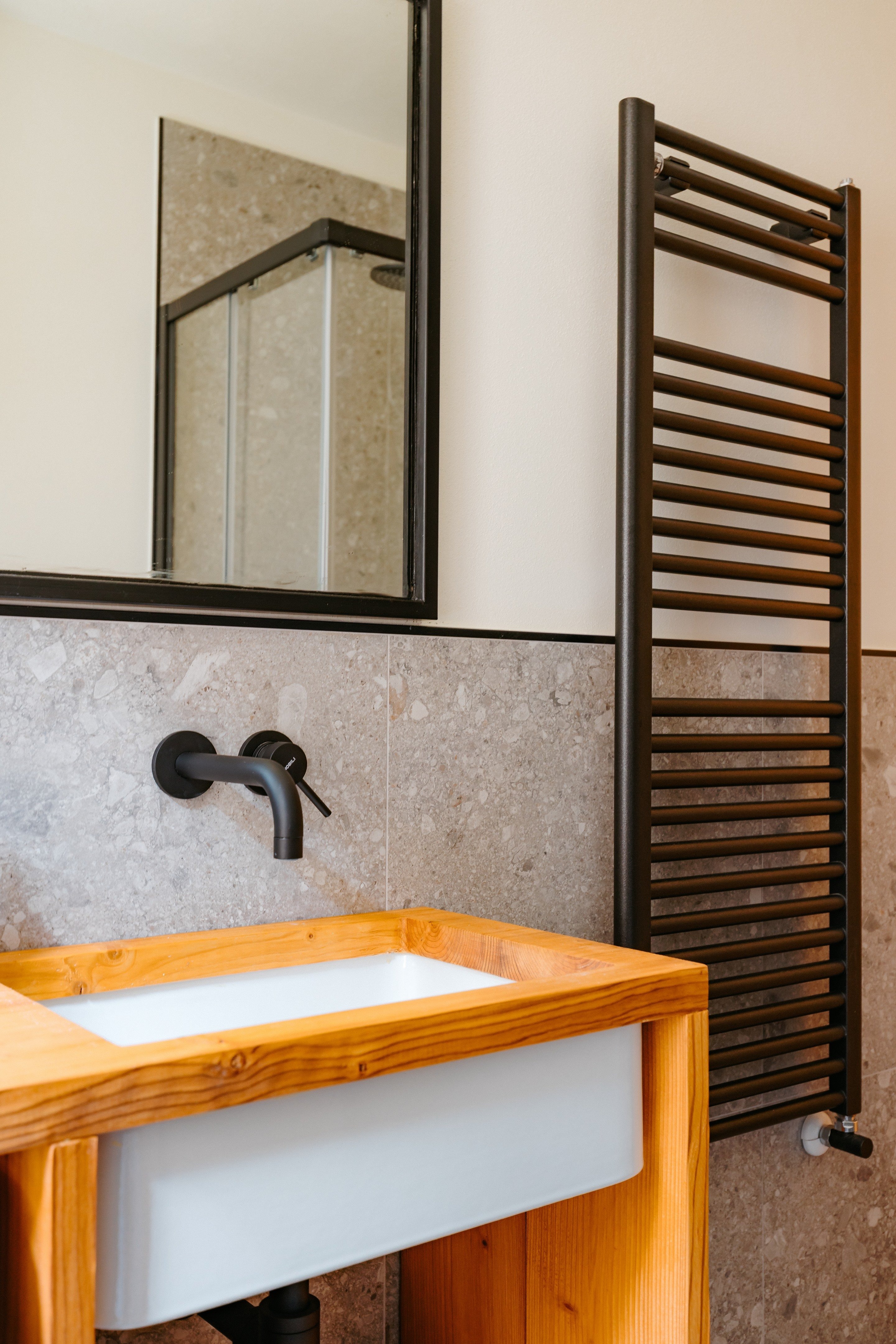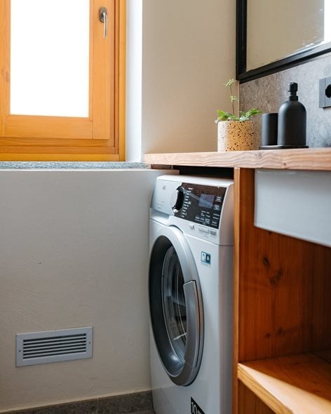 En el baño, el mobiliario fue diseñado a medida para optimizar el espacio y garantizar la máxima funcionalidad: un mueble de madera integra el lavabo y oculta la lavadora, manteniendo líneas limpias y una atmósfera ordenada y coherente. El uso de la madera, tratada con acabados hidrófugos, introduce una nota cálida que equilibra la presencia mineral de los revestimientos, creando un ambiente acogedor y funcional.
