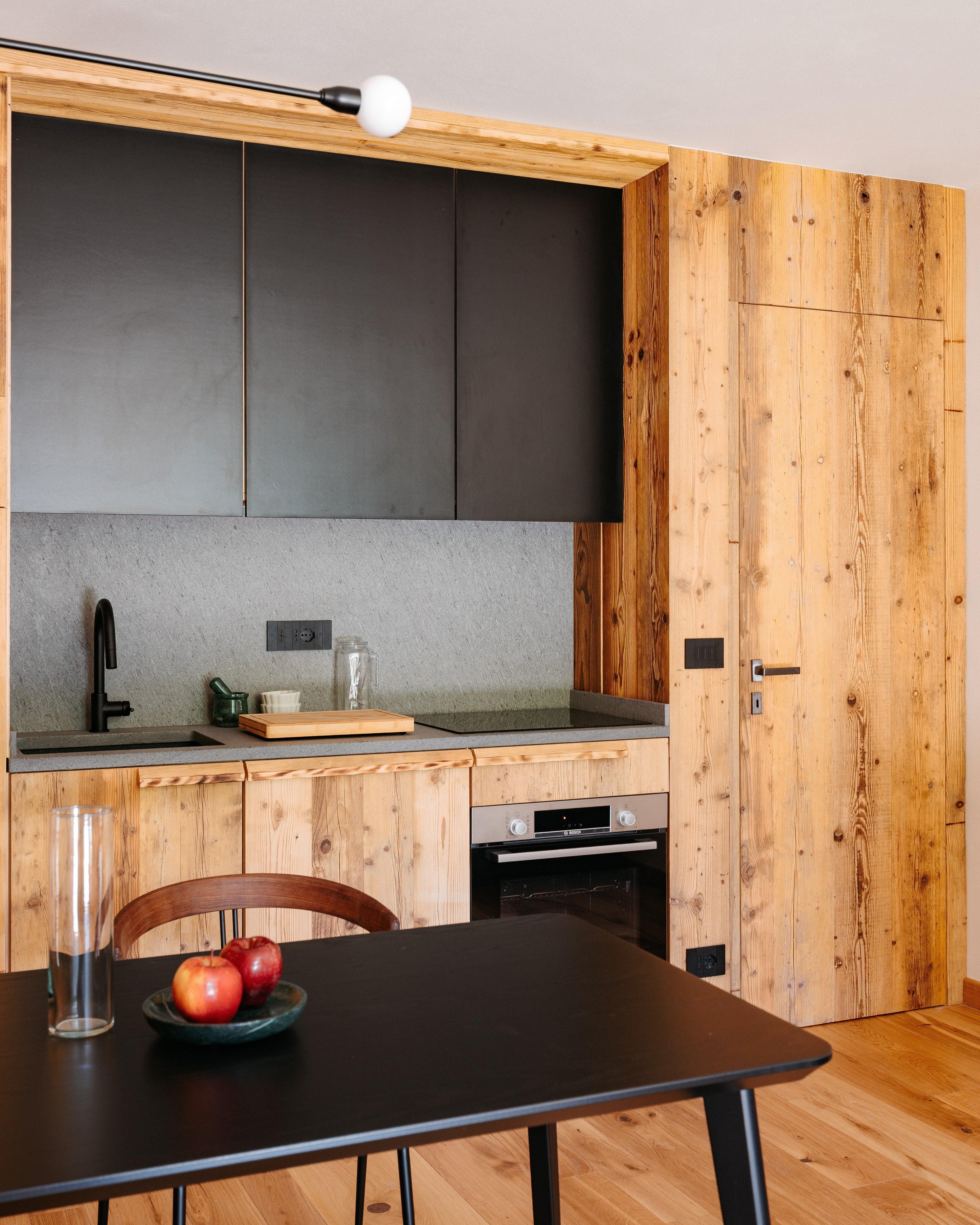 La cocina, diseñada a medida, se integra perfectamente con las boiseries y la puerta, apareciendo como un refinado bloque de madera. En su interior se creó un nicho (encimera y salpicadero) revestido de Gneis Diorítico o Pietra di Perosa, una piedra local que se combina de manera armónica con el abeto viejo, generando un contraste material y cromático muy sugerente.