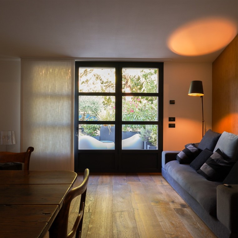In questa ristrutturazione e ampliamento di un’abitazione storica in centro città, tre sono gli elementi materici che emergono negli ambienti della casa: la pietra, il ferro e il legno.