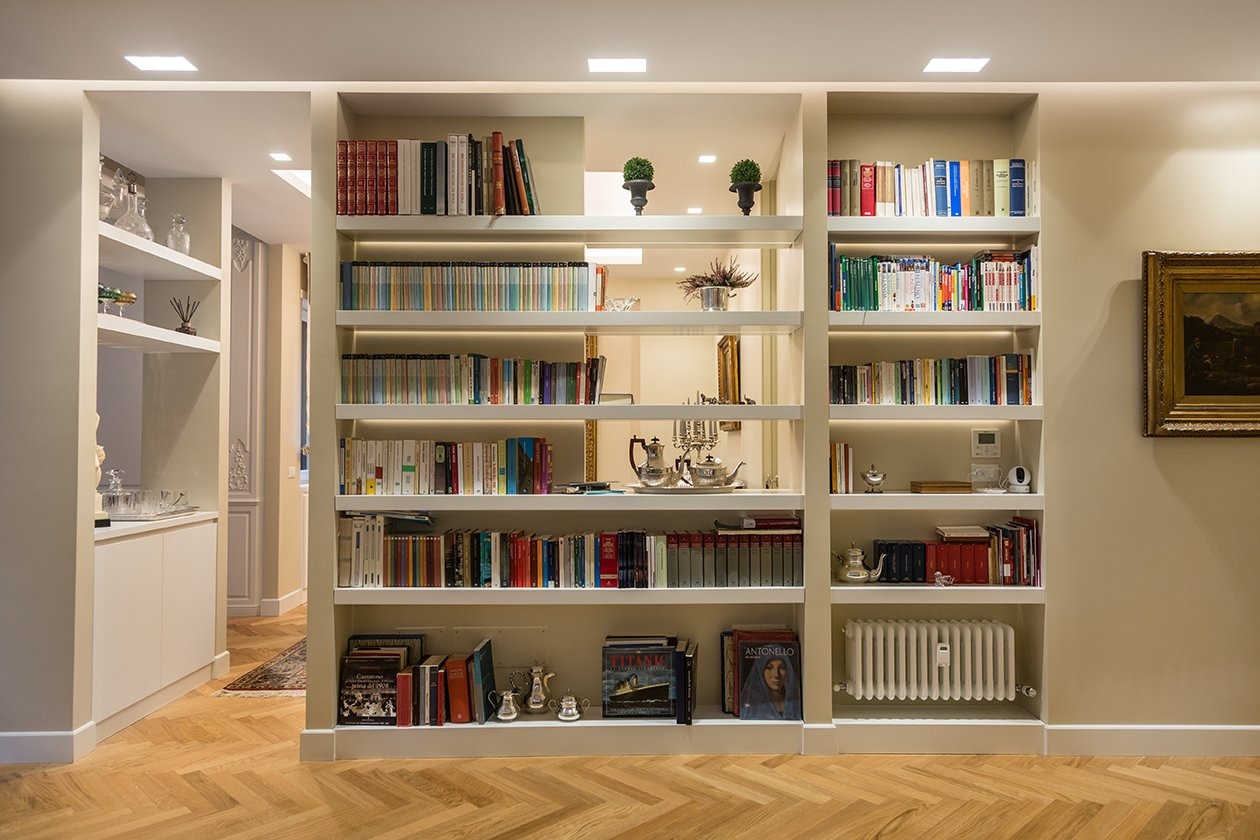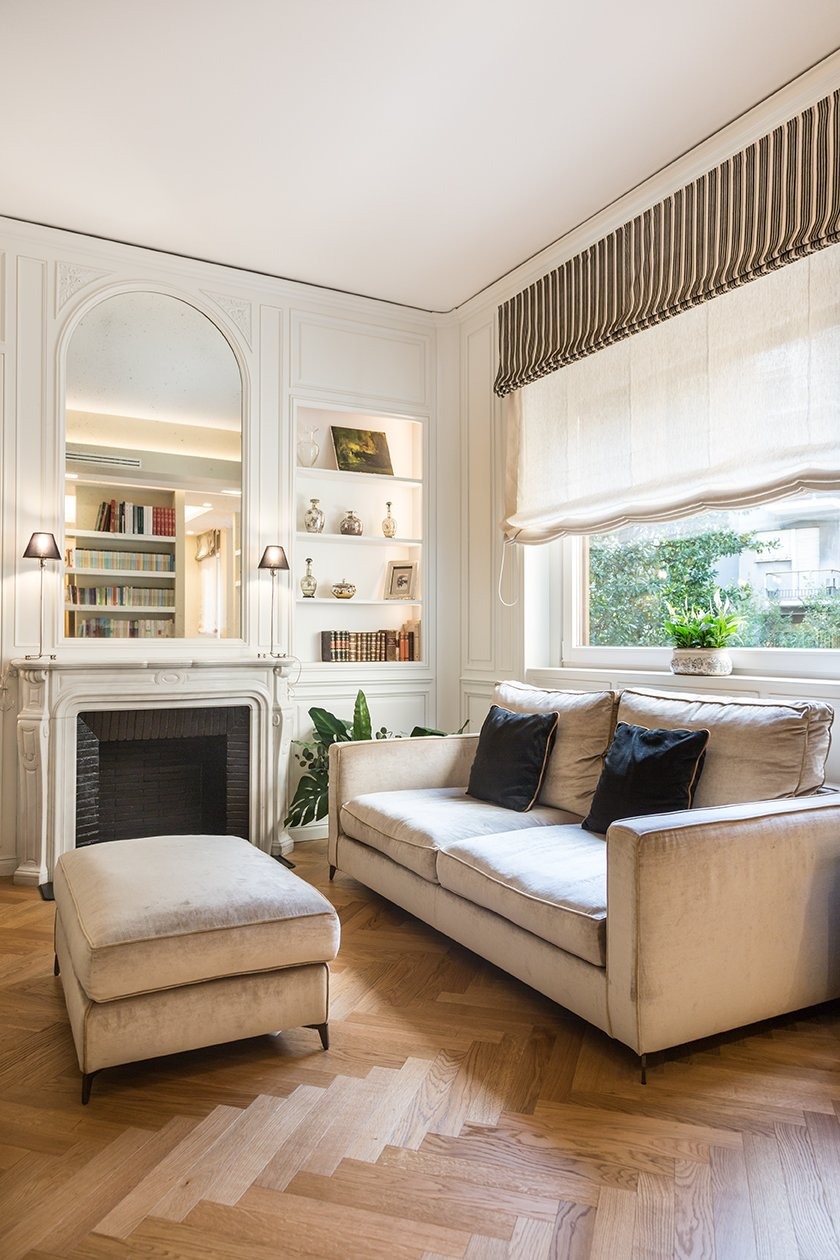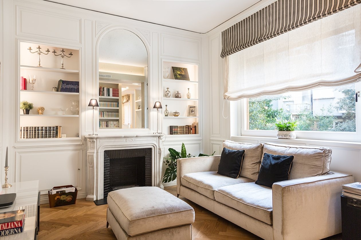 The rooms are defined by bookcases and suspended ceilings, and the flat's distinctive character is lent by Italian herringbone parquet, marble, antique woodwork and a Comino fireplace.