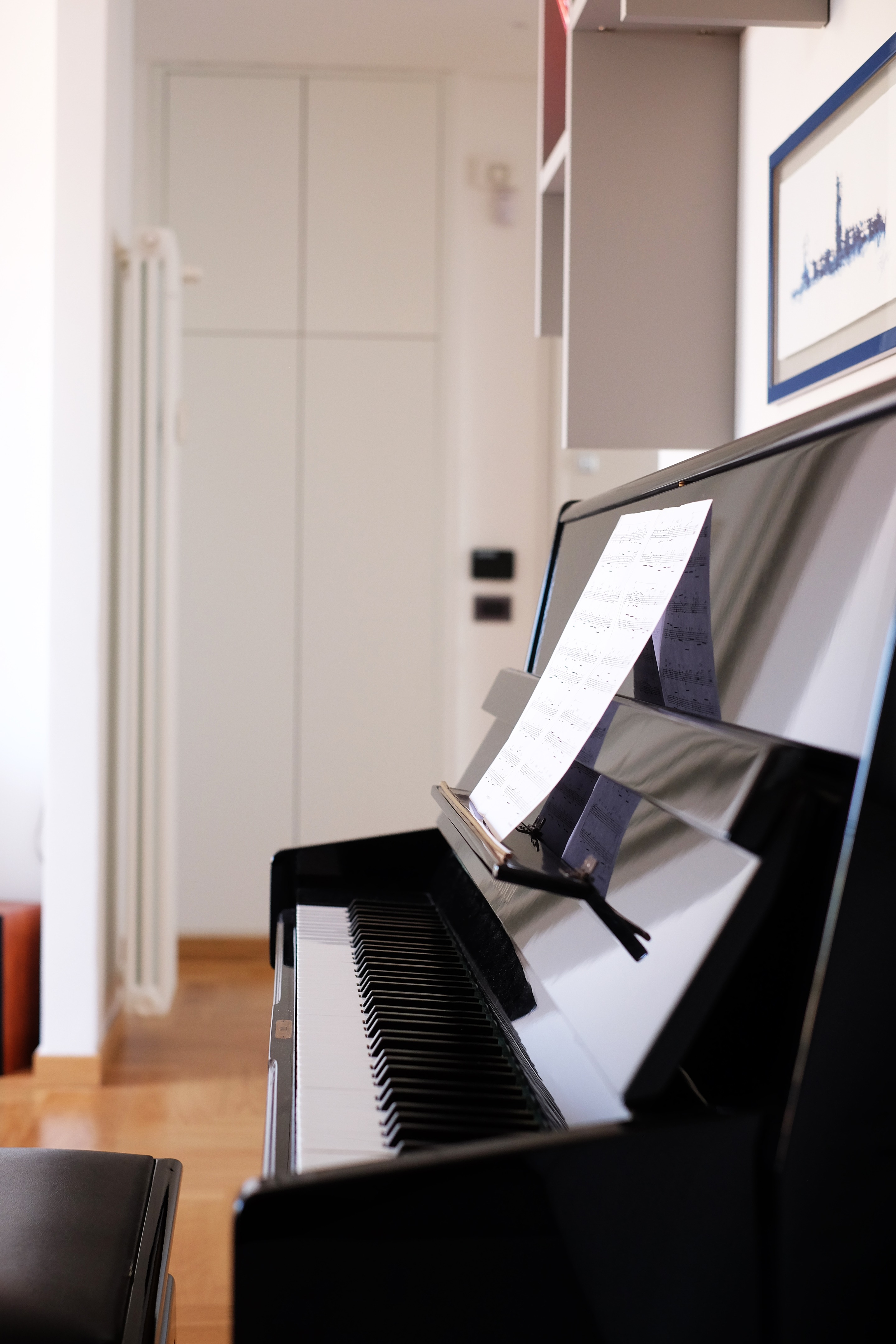 Overall, the apartment is characterised by expansive white walls, contrasted with the dark window frames and flooring, which varies from room to room. In the entrance, living room and corridors, natural oak parquet laid in a classic Italian herringbone pattern provides warmth and texture. Resin flooring was chosen for the study, kitchen, and guest bathroom, while tiles were used in the master bathroom and laundry.
