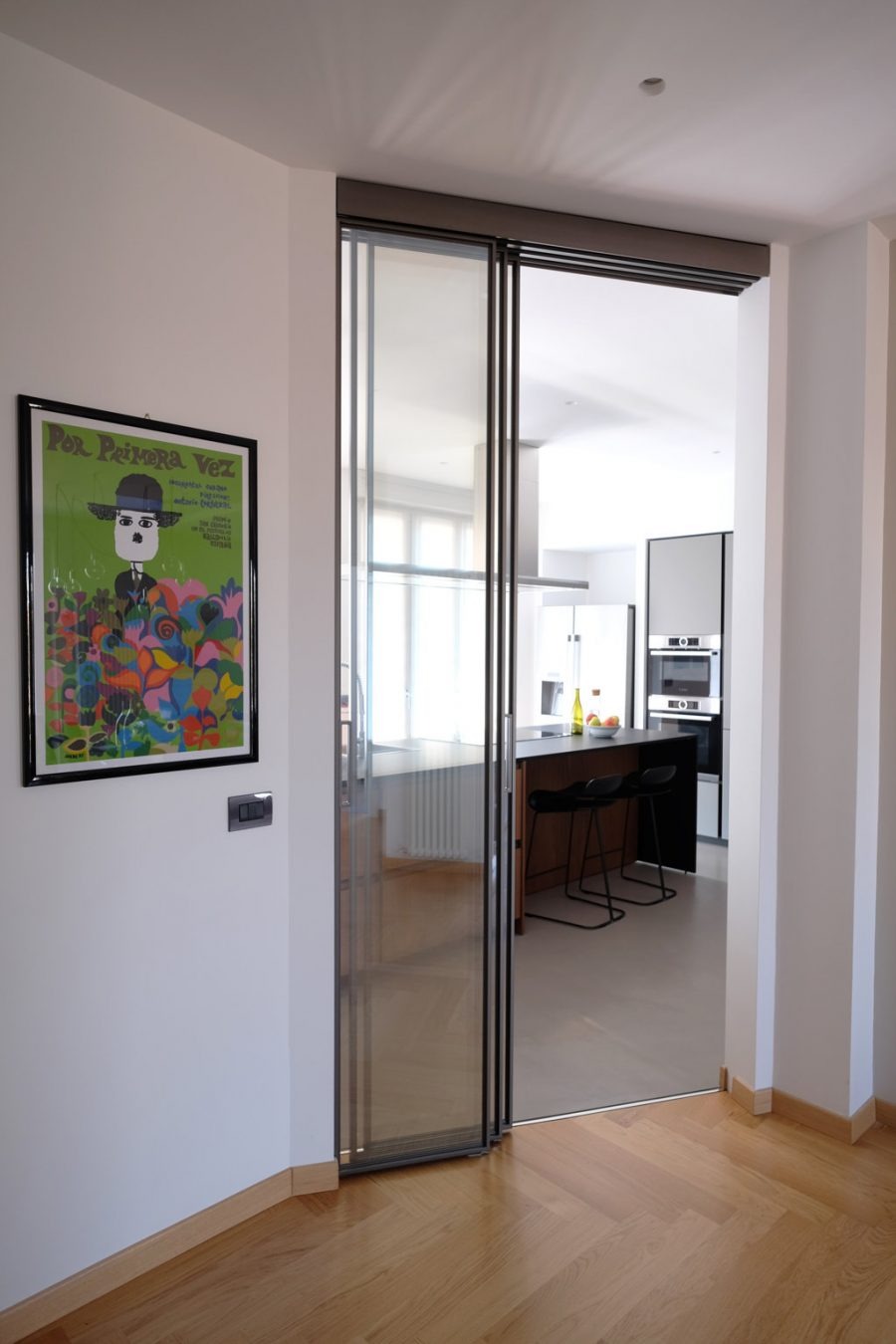 In the kitchen, a three-panel sliding glass wall reduces the footprint while creating a visual connection to the living and dining areas, giving the effect of an open-plan layout.